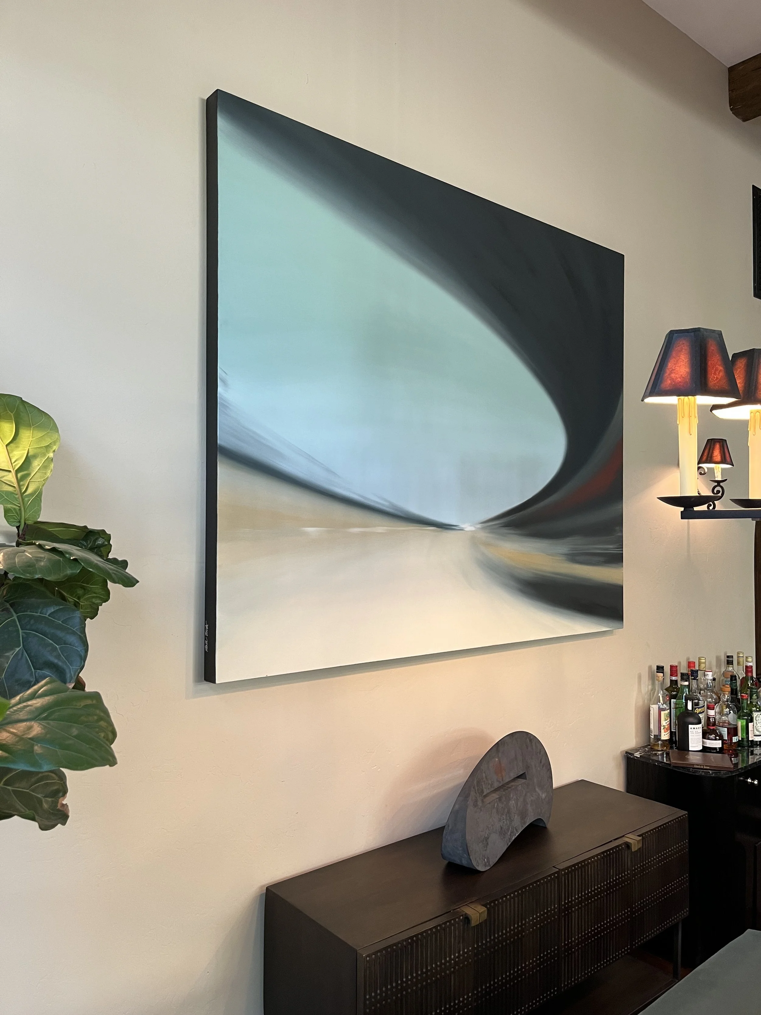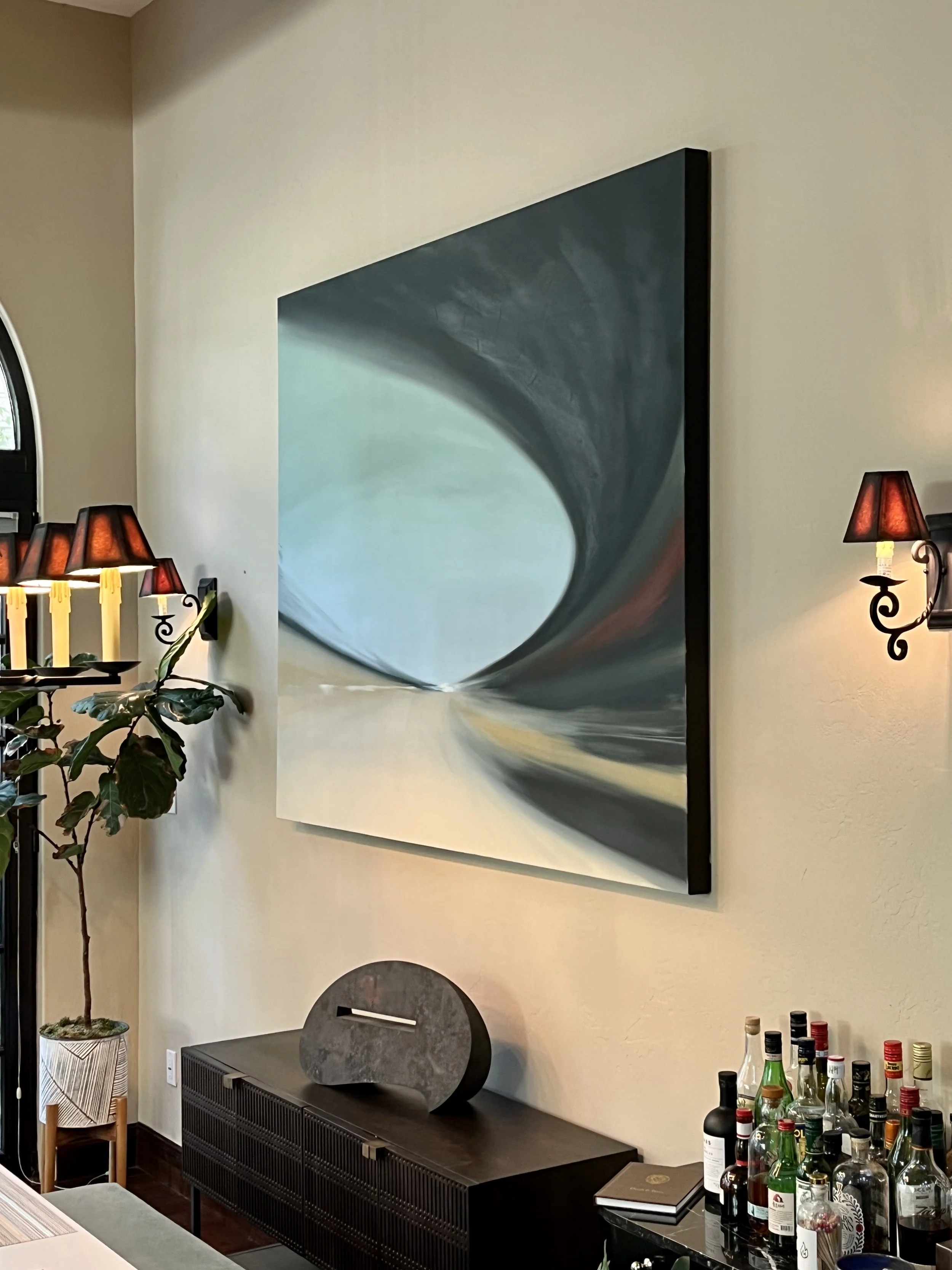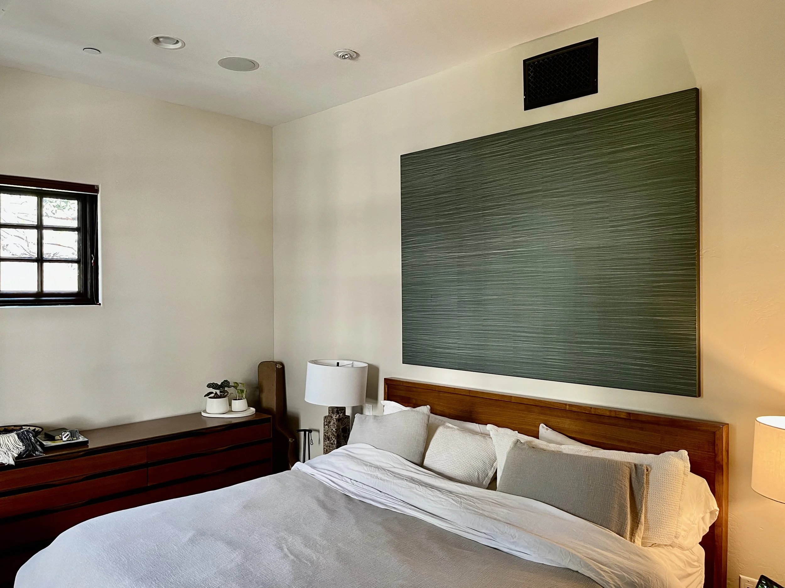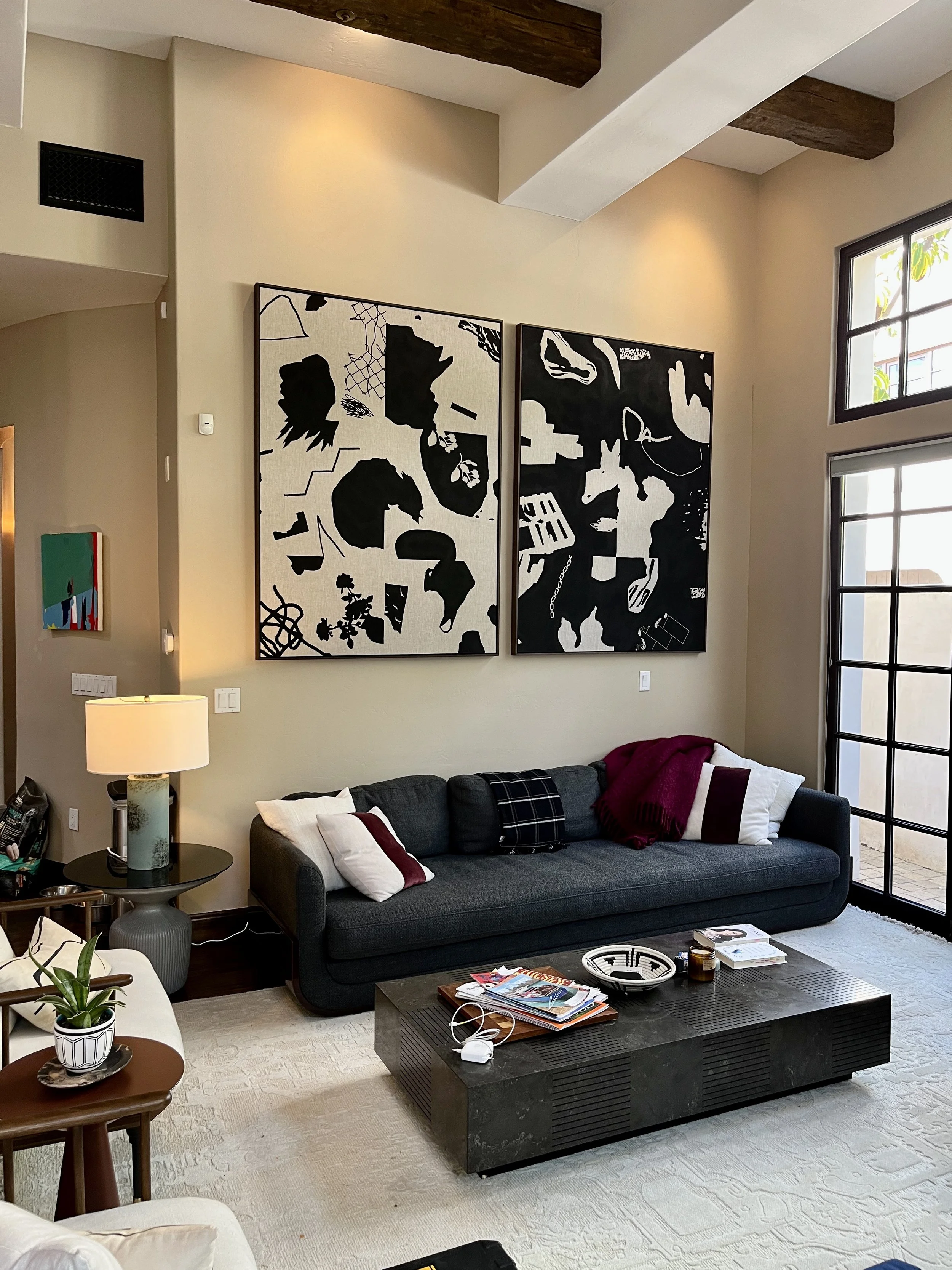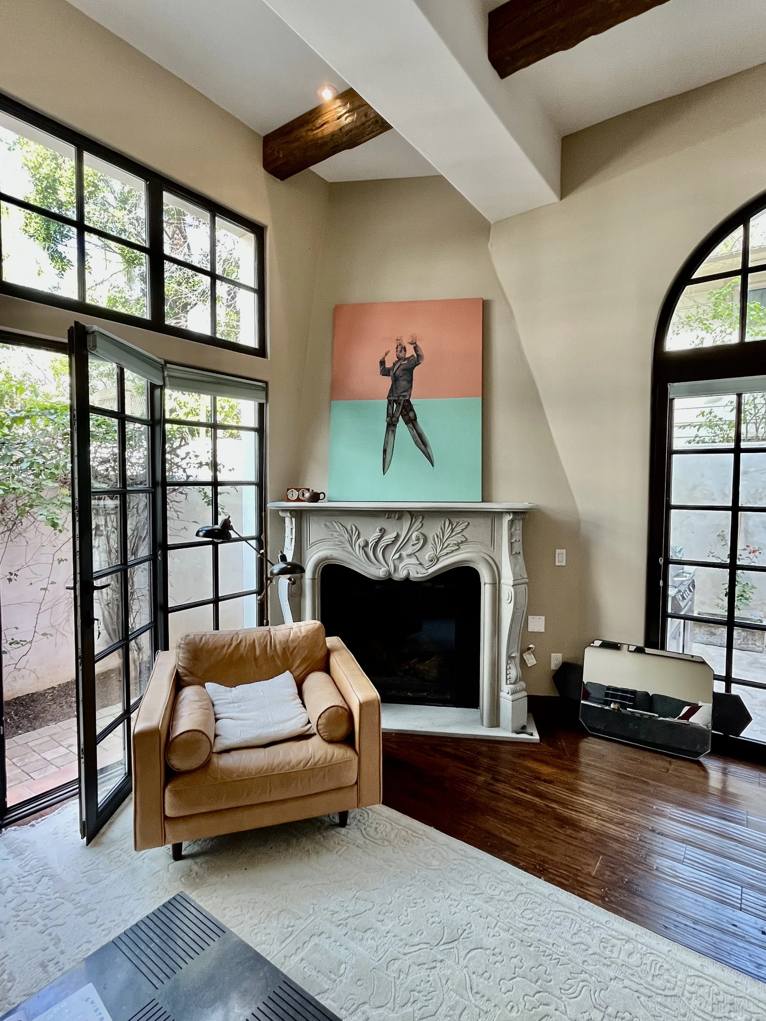 Paintings and sculpture by artists Davey Leavitt, Moncho 1929, Peter Scherrer, Miguel Osuna, and Brad Howe bring both color and texture to this Brentwood, Los Angeles, California residence.