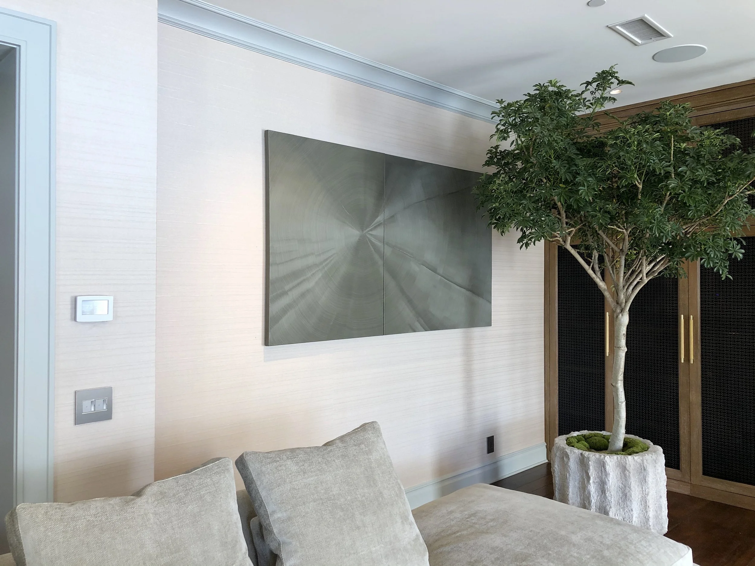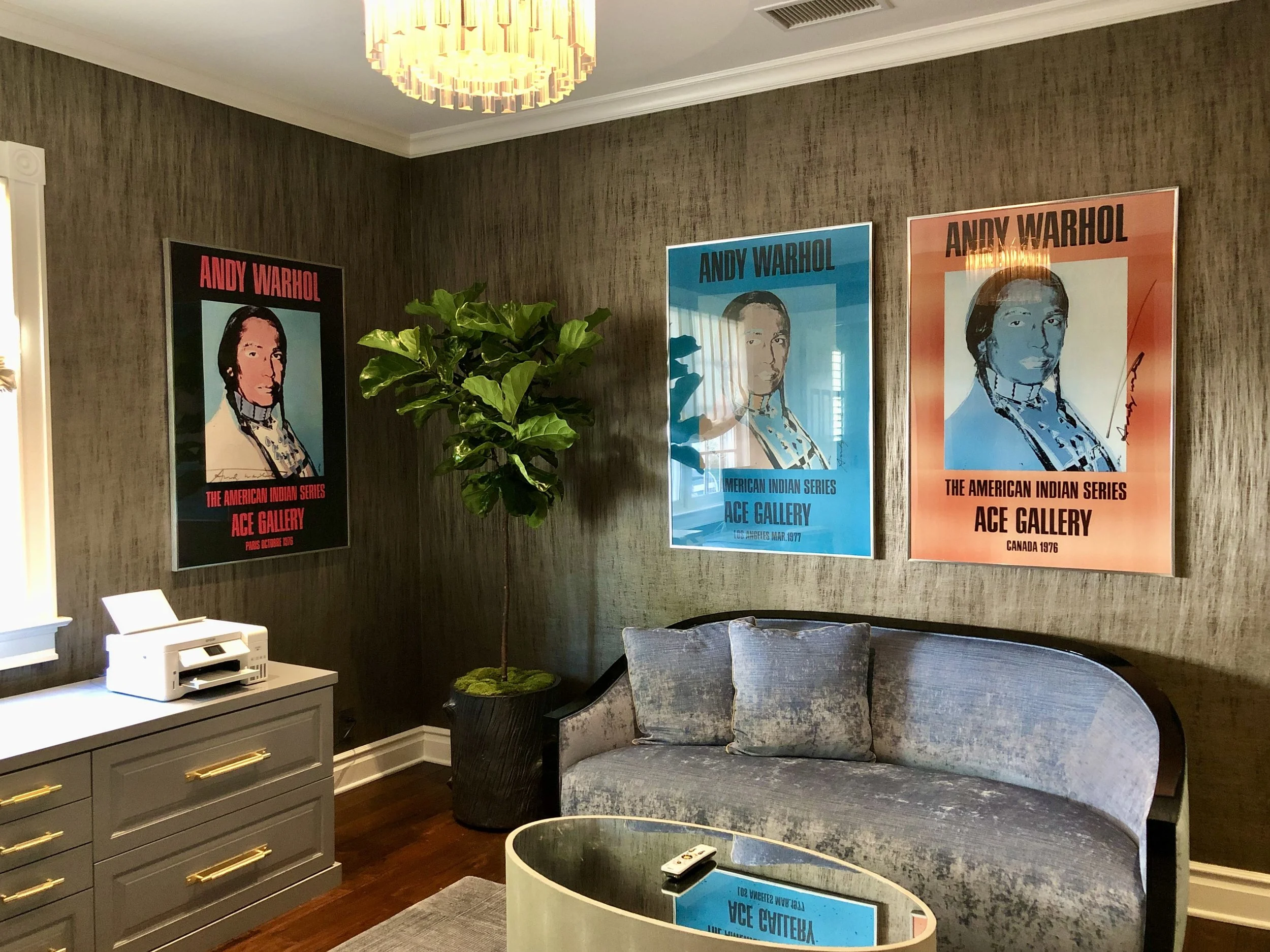 Prints and paintings by both blue chip artist, Andy Warhol, and local contemporary artists for Lake Sherwood Home with Interiors by Julia Wong. As seen in Interiors Magazine.
